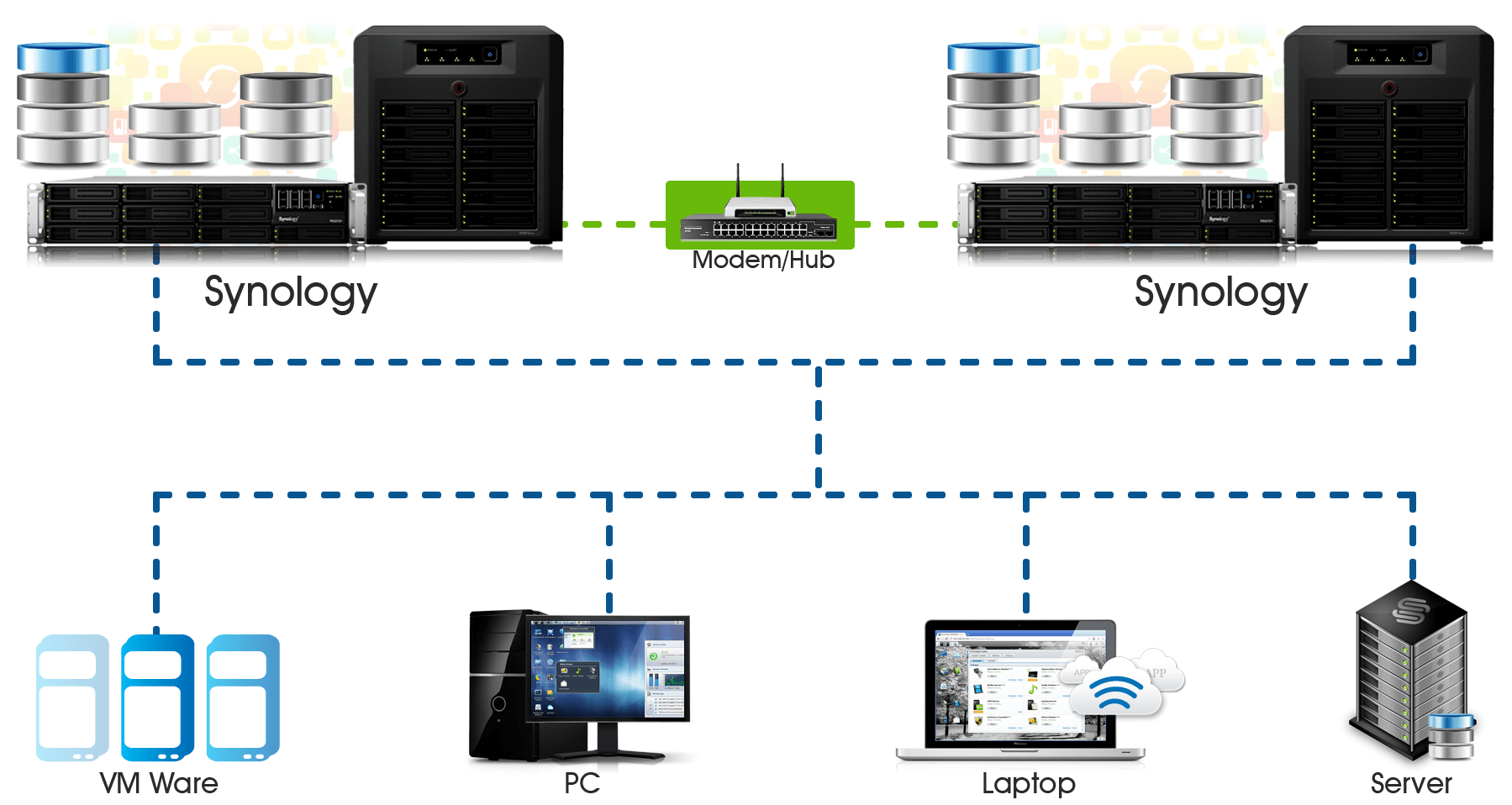 Với iSCSI hỗ trợ VMware, Citrix & Hyper-V giúp bạn có được giải pháp ảo hóa lưu trữ cho máy chủ. Synology tự động backup dữ liệu trên các iSCSI này dễ dàng theo dạng khối dữ liệu.