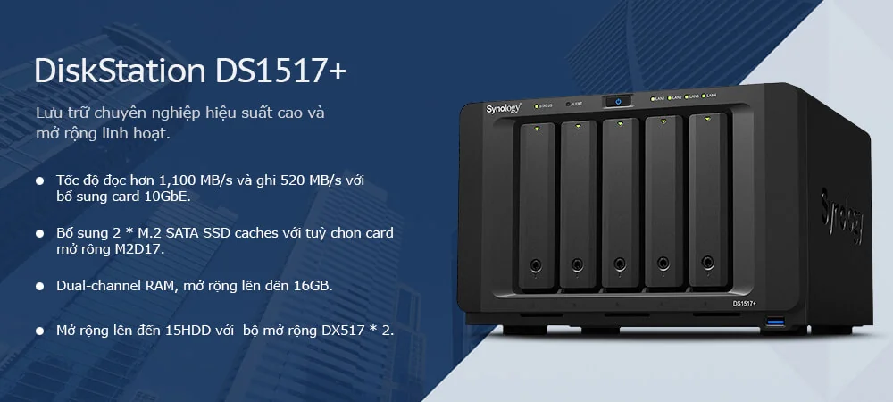 DS1517+ ỗ trợ 5bays HDD, sử dụng Quad-core CPU, mã hoá phần cứng AES-NI. 4 * 1GbE LAN, có thể bổ sung 10GbE (NIC) để gia tăng băng thông mạng hoặc thẻ nhớ Dual M.2 SSD tăng hiệu suất với bộ nhớ đệm.