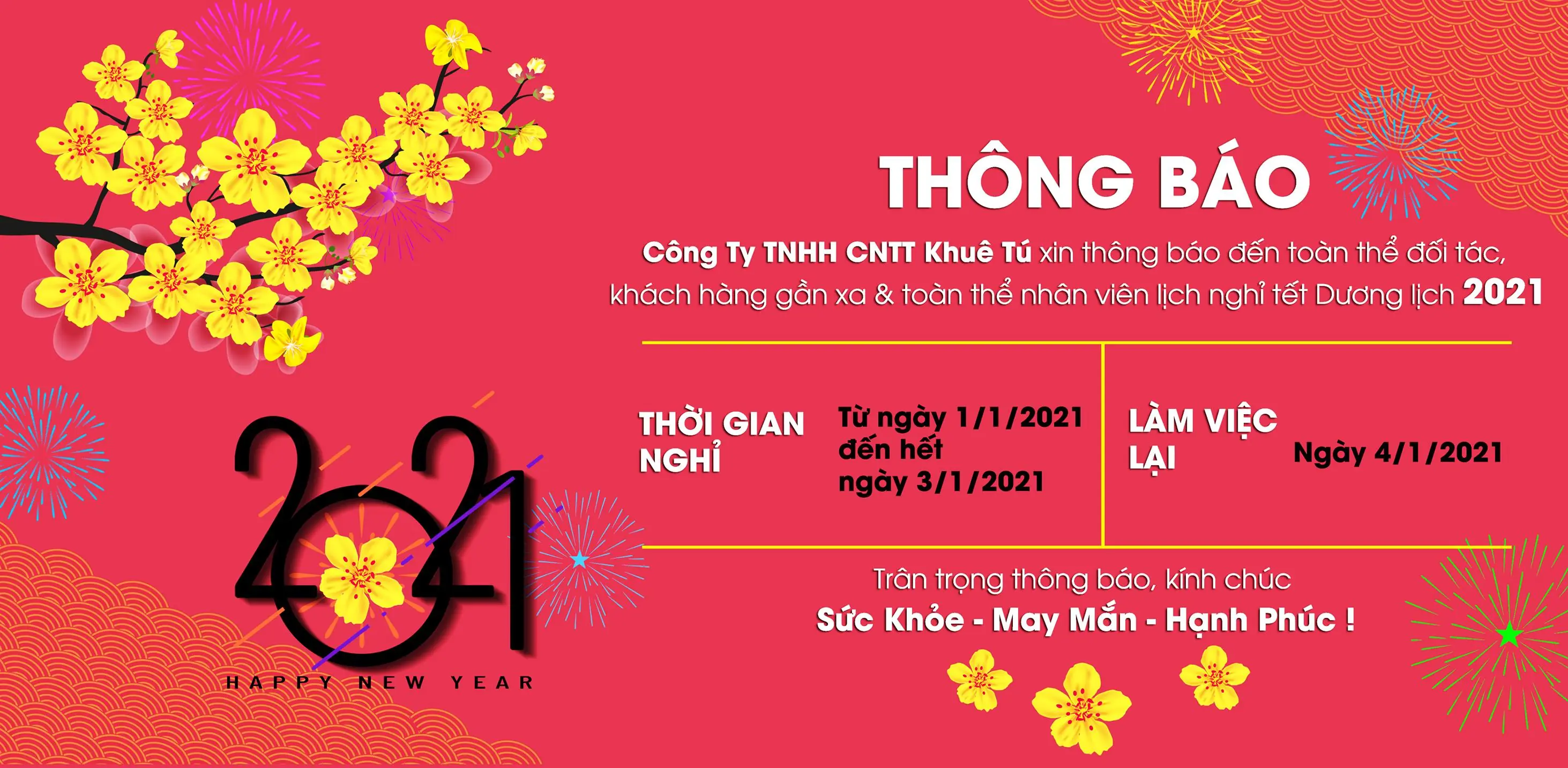 Công Ty KHUÊ TÚ kính chúc Quý Đối tác/ Quý Khách hàng một năm mới 2021 thành công, an khang, thịnh vượng.