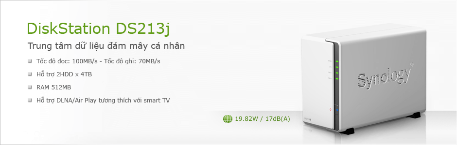 Synology DiskStation DS213j là một máy chủ dữ liệu đám mây được thiết kế đặc biệt để cung cấp giải pháp cho việc lưu trữ, bảo vệ và chia sẻ dữ liệu cho gia đình hoặc văn phòng làm việc nhỏ với mức tiêu thụ điện năng thấp, hoạt động êm ái và độ tin cậy cao. Chạy trên nền web hệ điều hành DiskStation Manager (DSM) – dễ sử dụng và nhiều tính năng.