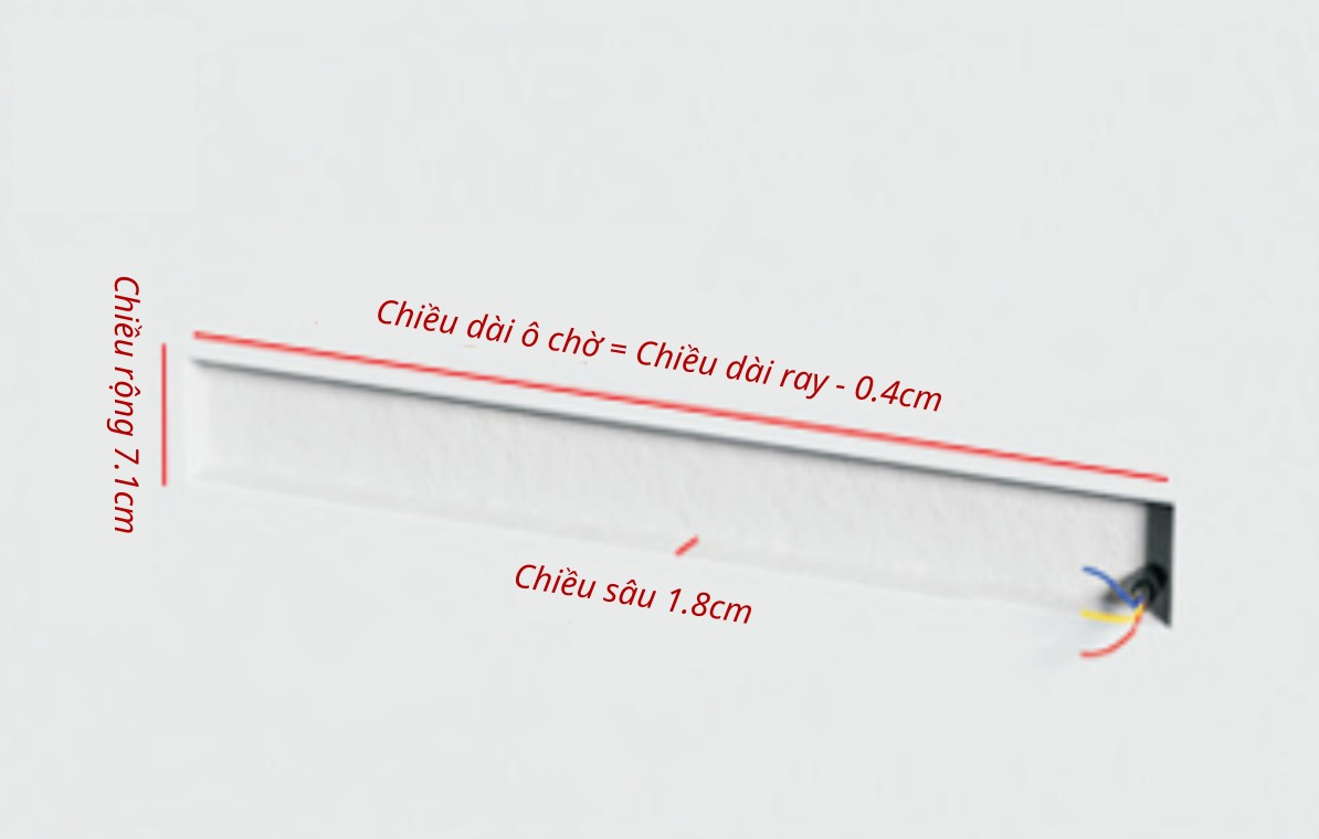 Ô chờ có chiều sâu 1.8cm, chiều rộng 7.1cm, chiều dài tùy thuộc vào độ dài thanh ray mà bạn đặt hàng trừ đi 0.4cm