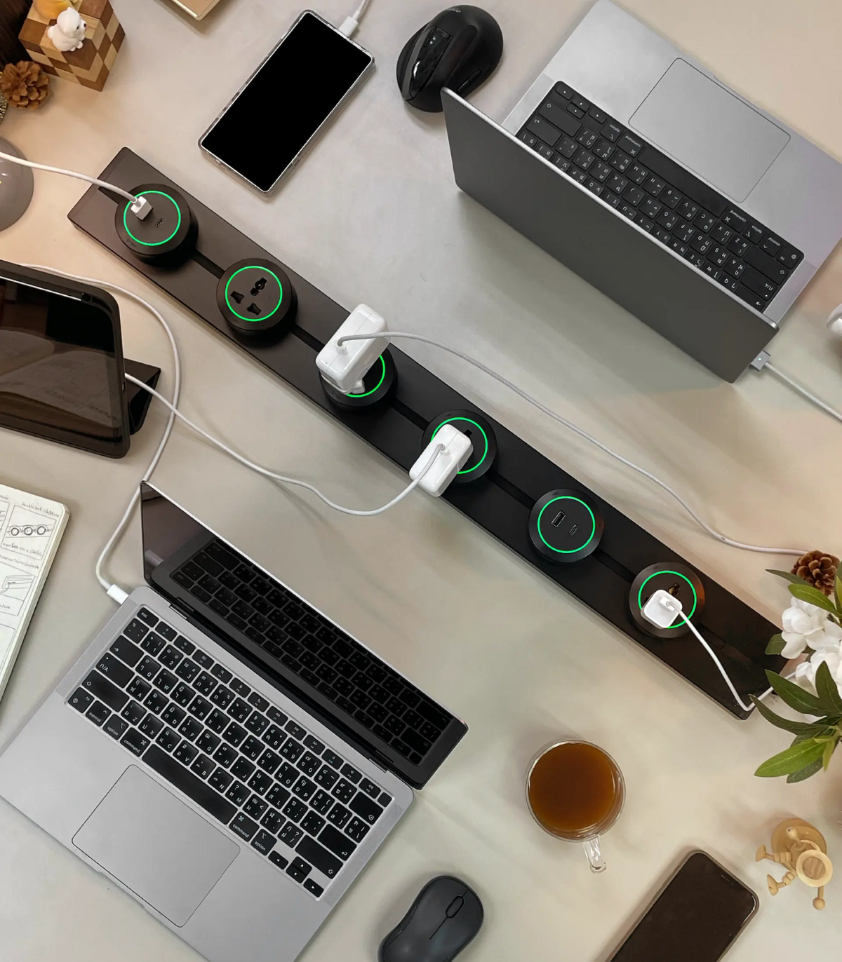 Khi thanh ray được cắt vừa theo chiều dài bàn, toàn bộ khu vực làm việc trở nên thoáng hơn, dễ sắp xếp và không còn cảm giác thiếu ổ hay phải nối thêm dây điện.