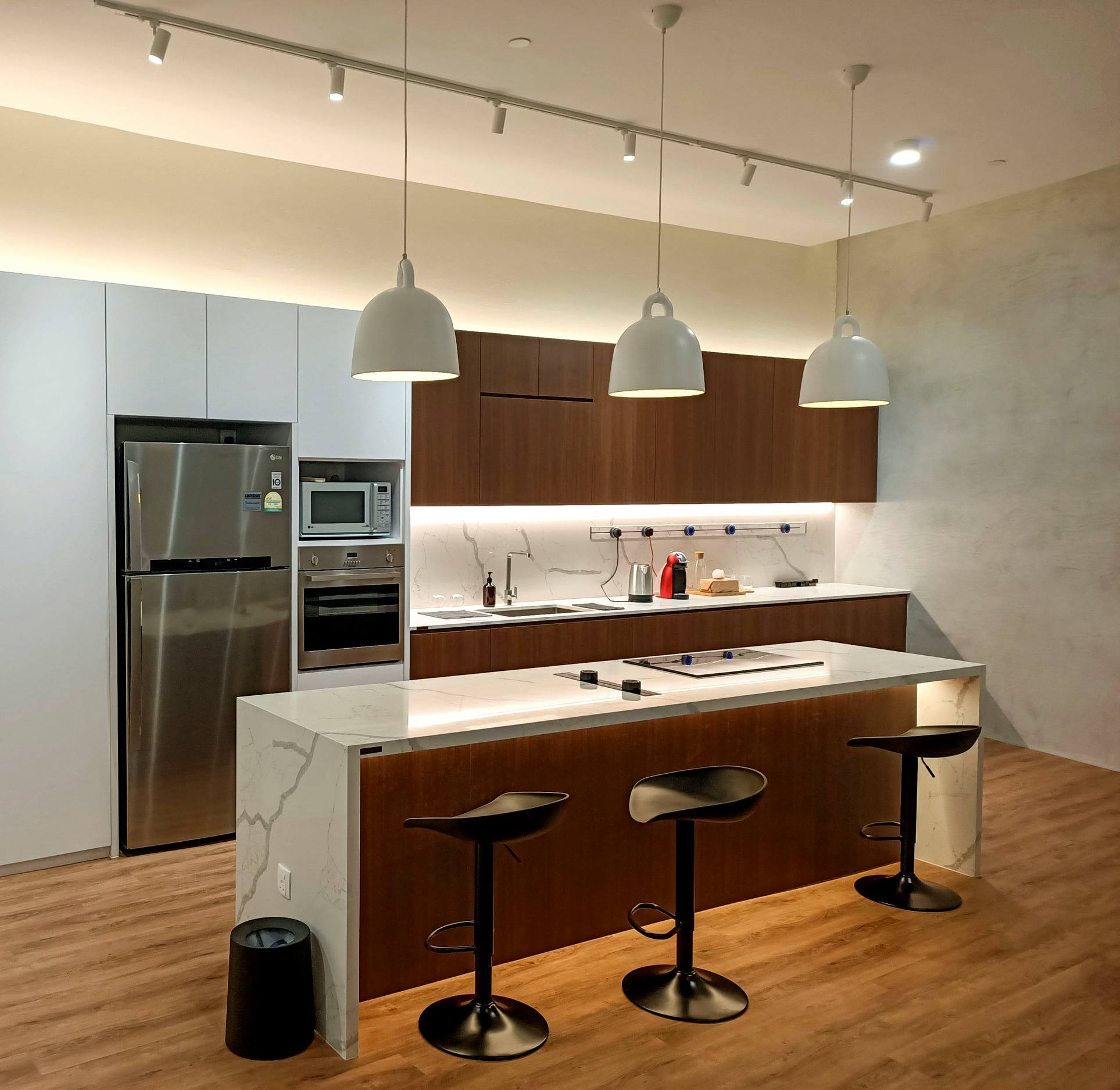 Khi được cắt thanh ray đúng chiều dài tủ bếp và phối màu hài hoà, giải pháp này vừa gọn gàng, vừa phù hợp với môi trường sử dụng nhiều điện năng.