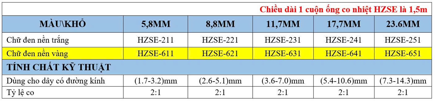 Ống co nhiệt HZSE có 2 màu chính là: nền trắng và nền vàng, giúp cho việc thi công dây cáp điên cáp mạng dễ dàng được phần biệt.