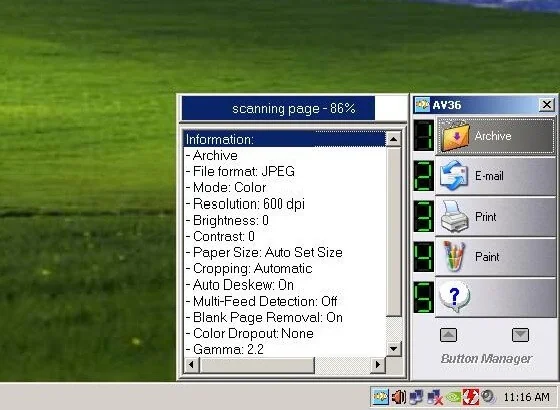 Ứng dụng Button Manager sau khi cài đặt có thể chạy nền, dùng để điều khiển các tính năng quét. Button Manager cho phép thiết lập sẵn các phím tắt để quét tài liệu thành tập tin lưu vào máy tính, gửi kèm email, in ramáy in, quét và chỉnh sửa bằng ứng dụng Paint của Windows, và nhiều tùy chọn khác.