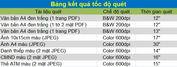 Bảng kết quả tốc độ quét của Avision AV36 thử nghiệm Test Lab cho thấy: văn bản A4 đen trắng quét ở độ phân giải chuẩn 200dpi rất nhanh, chỉ mất 12". Tốc độ quét 1 mặt và 2 mặt không chênh lệch nhau. Đồng thời, tốc độ quét văn bản ở độ phân giải cao nhất 600dpi cũng không chênh lệch nhiều so với độ phân giải 200dpi. Bên cạnh đó, thời gian thử nghiệm quét ảnh màu, danh thiếp, CMND, thẻ ATM cũng rất nhanh và cho chất lượng tốt.