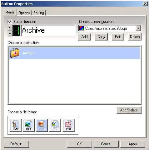 Button Manager hỗ trợ 5 định dạng tập tin hình ảnh để lưu kết quả quét: BMP, TIFF, JPEG, GIF và PDF.