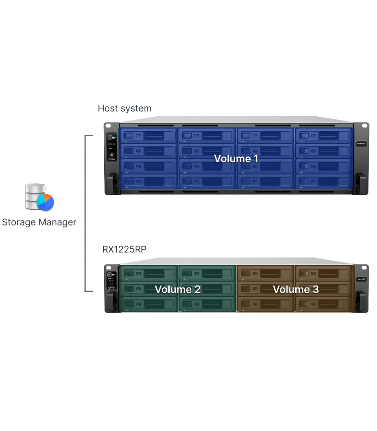 Thêm 12 khay lưu trữ bổ sung vào các hệ thống RackStation tương thích với một RX1225RP mà không cần thời gian ngừng hệ thống hoặc dịch vụ.