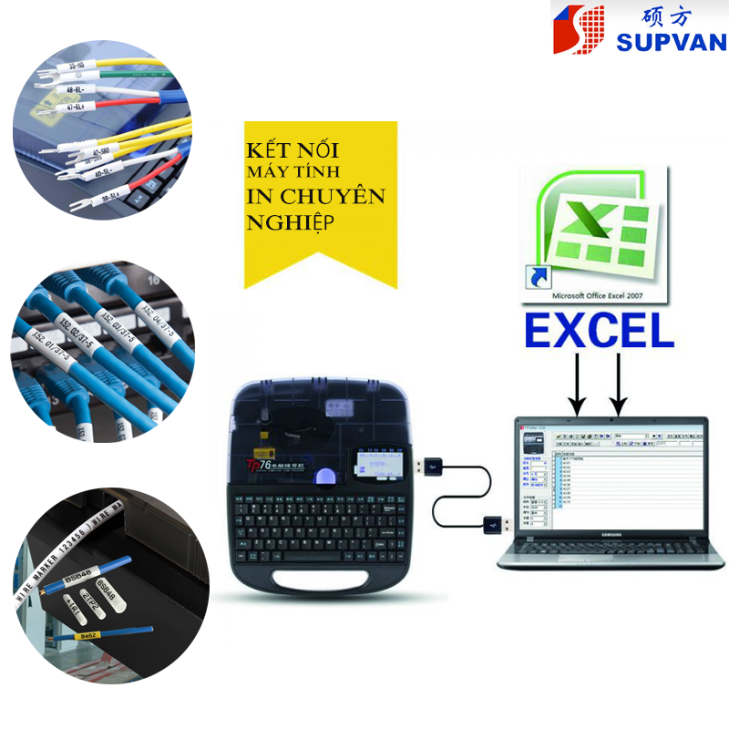 Có thể kết nối với máy tính qua USB, nhập trực tiếp từ Excel để in hàng loạt.