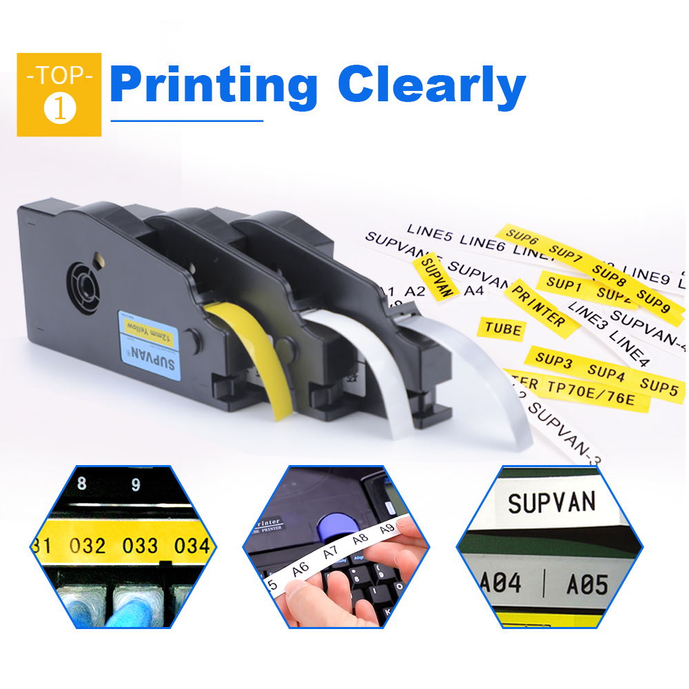 Nhãn in Supvan TP-L12EY 12mm màu vàng, có keo sẵn, in xong dán ngay. Ứng dụng rộng rãi cho tủ điện, tủ mạng, thiết bị điện trong văn phòng, bệnh viện, khách sạn.