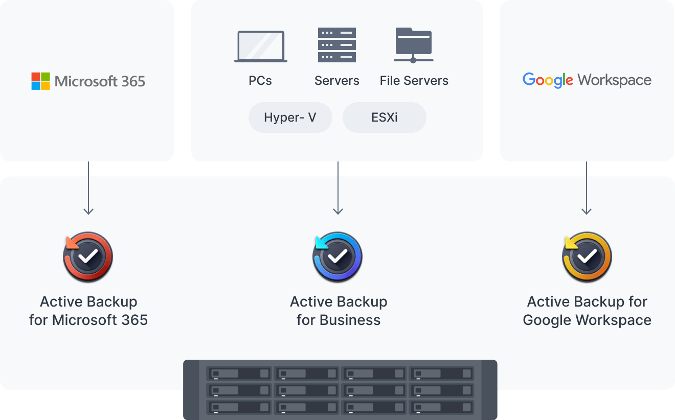 Hợp nhất và tự động hóa các tác vụ sao lưu cho PC, máy chủ, máy ảo, ứng dụng SaaS, v.v. với Active Backup Suite. Quản lý tất cả tác vụ sao lưu từ bảng điều khiển trung tâm và nhanh chóng khôi phục các tập tin cụ thể, toàn bộ thiết bị, dịch vụ ảo và tài khoản SaaS của nhân viên để duy trì hoạt động kinh doanh.