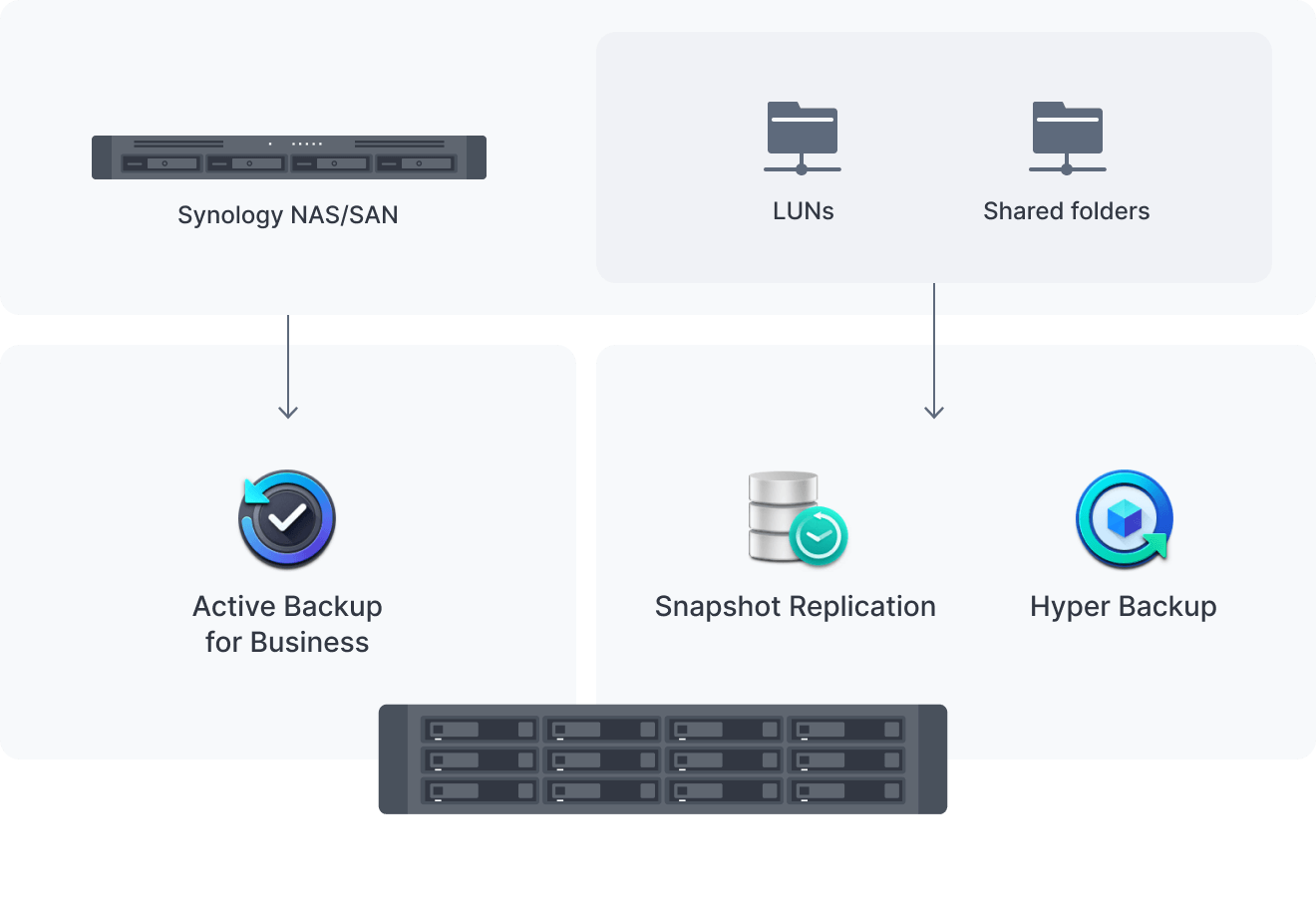 Sao lưu các thư mục, LUN, ứng dụng và cấu hình chia sẻ từ máy chủ Synology lên máy chủ phụ, thiết bị ngoài hoặc C2 Storage3 qua Hyper Backup. Lên lịch cho các tác vụ sao lưu, giữ các phiên bản bạn cần với chính sách lưu giữ linh hoạt và giảm kích thước sao lưu bằng tính năng khử trùng lặp dữ liệu tích hợp. Hoặc hạn chế tình trạng mất dữ liệu với tính năng Snapshot Replication, tạo bản ghi nhanh tạm thời trong khoảng thời gian ngắn nhất là 5 phút.