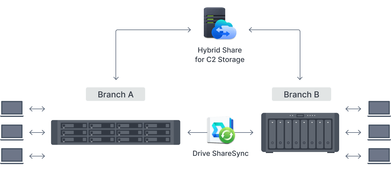 Đồng bộ hoặc phân phối dữ liệu giữa các máy chủ với Synology Drive ShareSync để phân bổ các tập tin công việc mới nhất cho các nhóm làm việc trên toàn thế giới. Hoặc tạo hệ thống tập tin toàn cầu bao gồm bộ nhớ đám mây C2 Storage và nhiều hệ thống Synology có tính năng Hybrid Share.