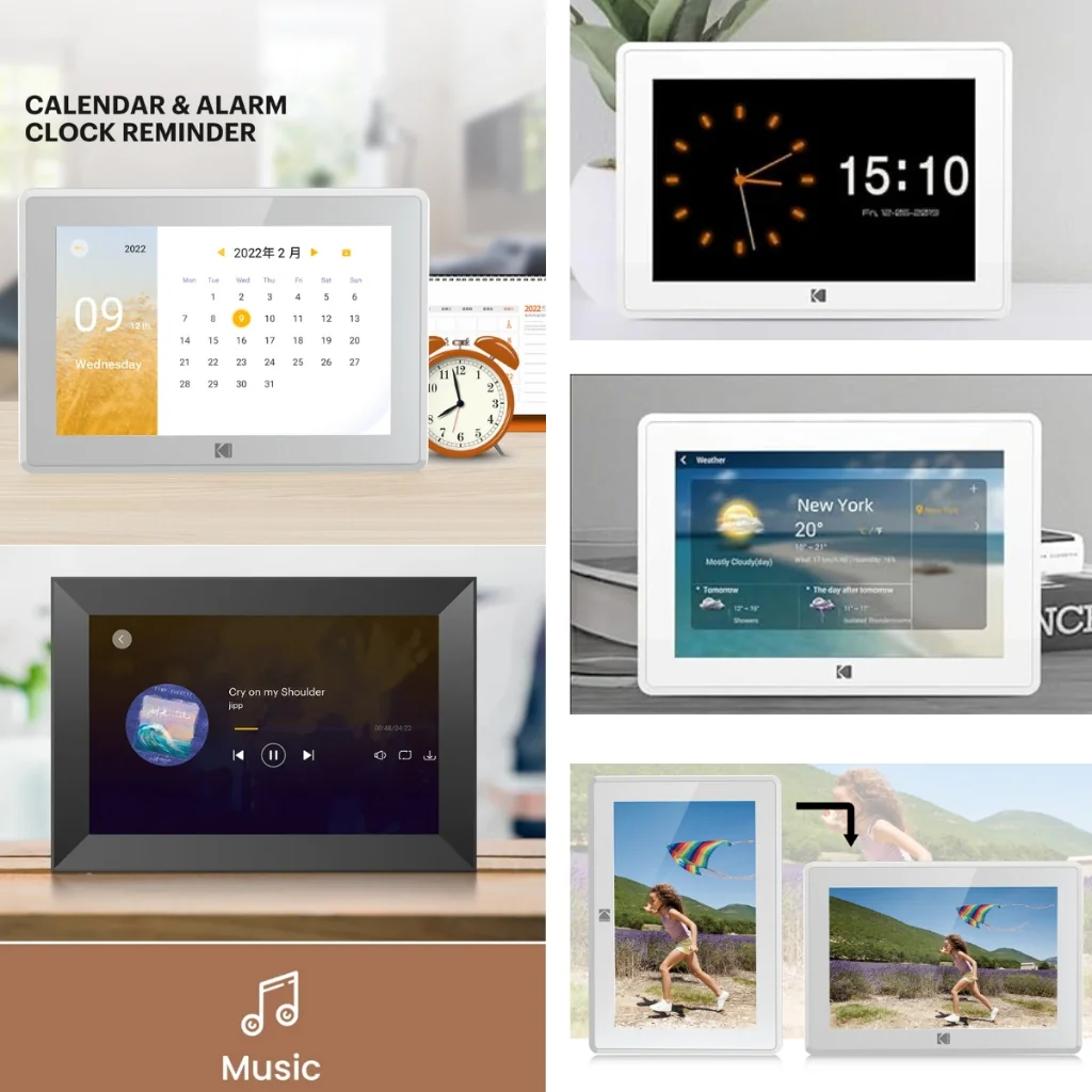 Cho phép bạn theo dõi thời gian, ngày và khí hậu, Khung ảnh kỹ thuật số Kodak RCF-106 có chức năng dự báo lịch và thời tiết tích hợp. Để thuận tiện cho bạn, ảnh có thể được gửi đến nhiều khung hình cùng một lúc.